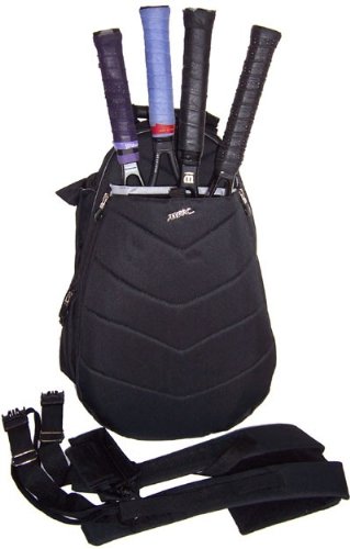 This roomy two-strap tennis bag was designed as a backpack with a comfortable waist strap for better support. This bag has padded straps for increased comfort as well as a heavy duty handle to carry the bag in hand. This pack includes two separate compartments that will hold four or more racquets. The main compartment on the deluxe two strap is very spacious with six individual pockets to hold personal items. This bag features an insulated water cooler, two zipper pockets on the back of the bag, built in fence hooks, pocket to tuck away waist strap, cell phone holder, ID holder and YKK zippers. Dimensions: 21L x 13W x 19D